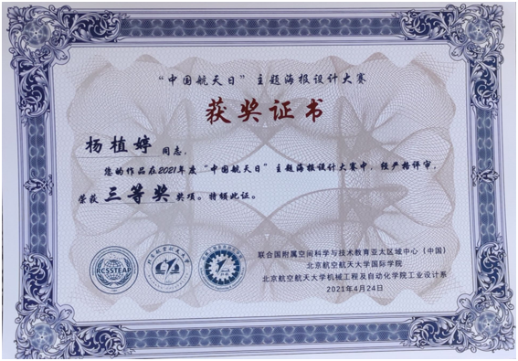 此次2021年“中国航天日”主题海报设计大赛由联合国附属空间科学与技术教育亚太区域中心(中国)、北京航空航天大学国际学院、北京航空航天大学机械工程及自动化学院工业设计系联合主办。在所有参赛选手中,我校视觉18级杨植婷、陈美琦同学分别获得三等奖和优秀奖,学院获得优秀组织单位奖。