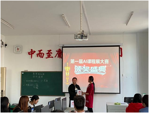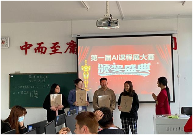 在颁奖仪式中,佟老师首先提到:本学期AI课程已经接近尾声,决定本节课对在课程展中表现优秀的学生颁发奖品以资鼓励。随后,佟老师表示对获奖学生的祝贺以及对其他同学的鼓励,希望所有同学。佟老师赠送所有同学三个字:“勤”、“谨”、“灵”,希望大家在学习中勤勉、严谨、灵活的运用所学知识。最后,佟老师表示:本次课程大赛颁奖仪式是第一届,也希望今后可以有第二届、第三届,一届一届延续下去,同学们在今后的学习中要再接再厉。