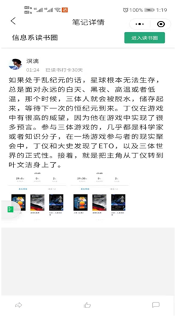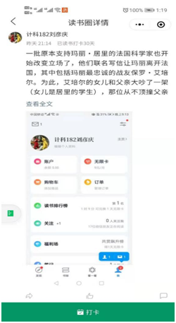 另外,在读书圈中,同学们也积极展开讨论式、互动式交流,真正在本次活动中有所收获。2月16日学生会学习部进行打卡截图汇总,以及系内评选,推选电科171班裴智超、电科201班赵雨婷、计科192班冯浩、计科201班彭新伟、计科202班冯晓雪、视觉191班于娉、视觉192班邹宇鑫、电科191班朱鑫露、视觉202班时梦娜、视觉203班候慧莹,共10名同学成为“阅读之星”。