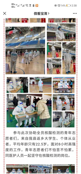 1月18日—24日,家住宝清县的计科192班梁涛和计科194班宋欣雨两名同学,响应号召,参加全县核酸检测志愿服务。