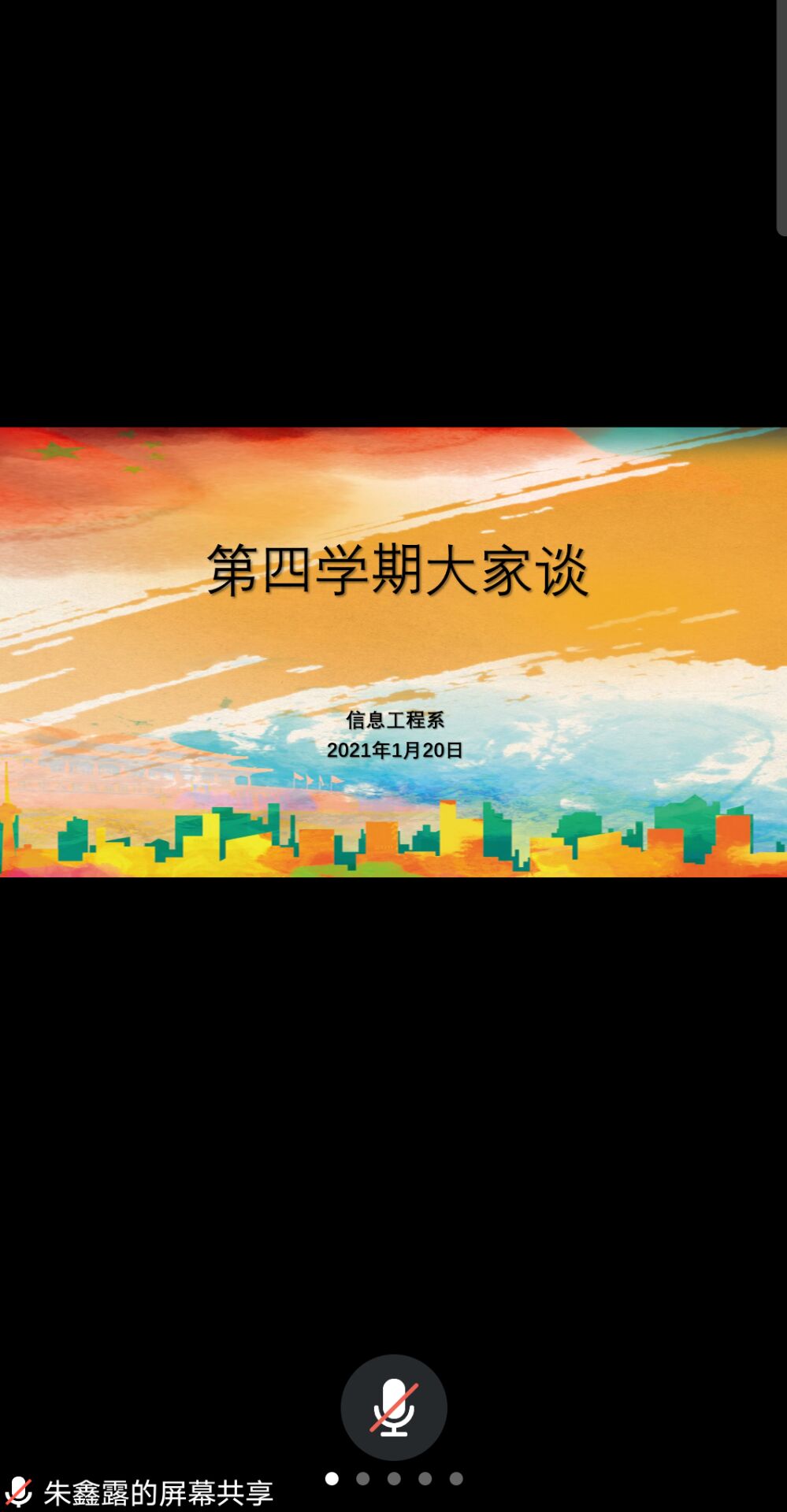 1月20日9:30,信息工程系使用腾讯会议,组织第一期线上“第四学期大家谈”分享活动。本次活动由党员学长电科171班裴智超组织策划,电科191班朱鑫露主持。