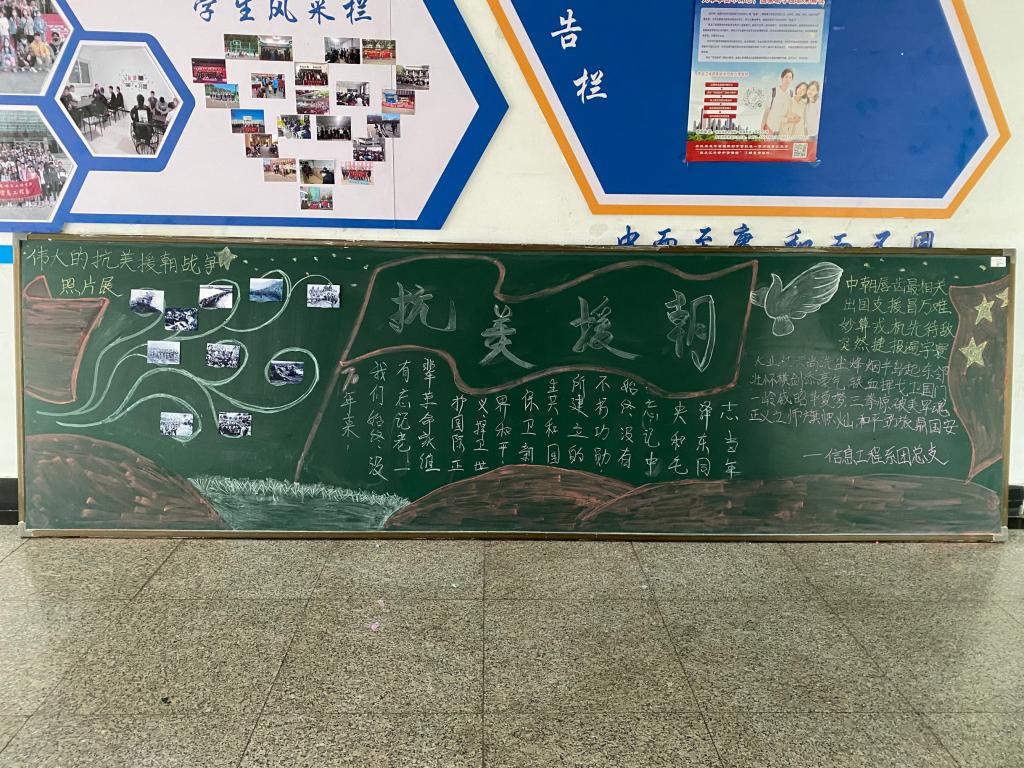 “抗美援朝”主题展板,通过对抗美援朝重要史迹的绘制,以及抗美援朝事迹图片的张贴,体现出全体信息工程系人浓烈的爱国情怀。展板汇集了抗美援朝重要事迹、标语、事件,使同学们经过展板前时不由得肃然起敬,表现出对抗战先辈们崇高的敬意。