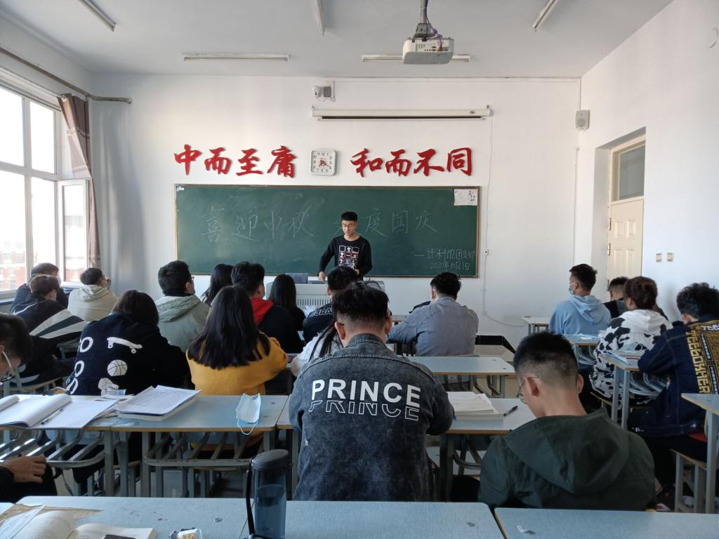 这次的双节中,班集体首先分发了由系里购买的月饼,每人一块月饼,小小的一块月饼,寄托着浓浓的情思。随后团支书梁涛对同学们表达了中秋和国庆的双节快乐,这是一个特殊的节日,国是千万家,家庭的命运同国家的前途紧紧相连,广大学生要以身作则,从我做起。