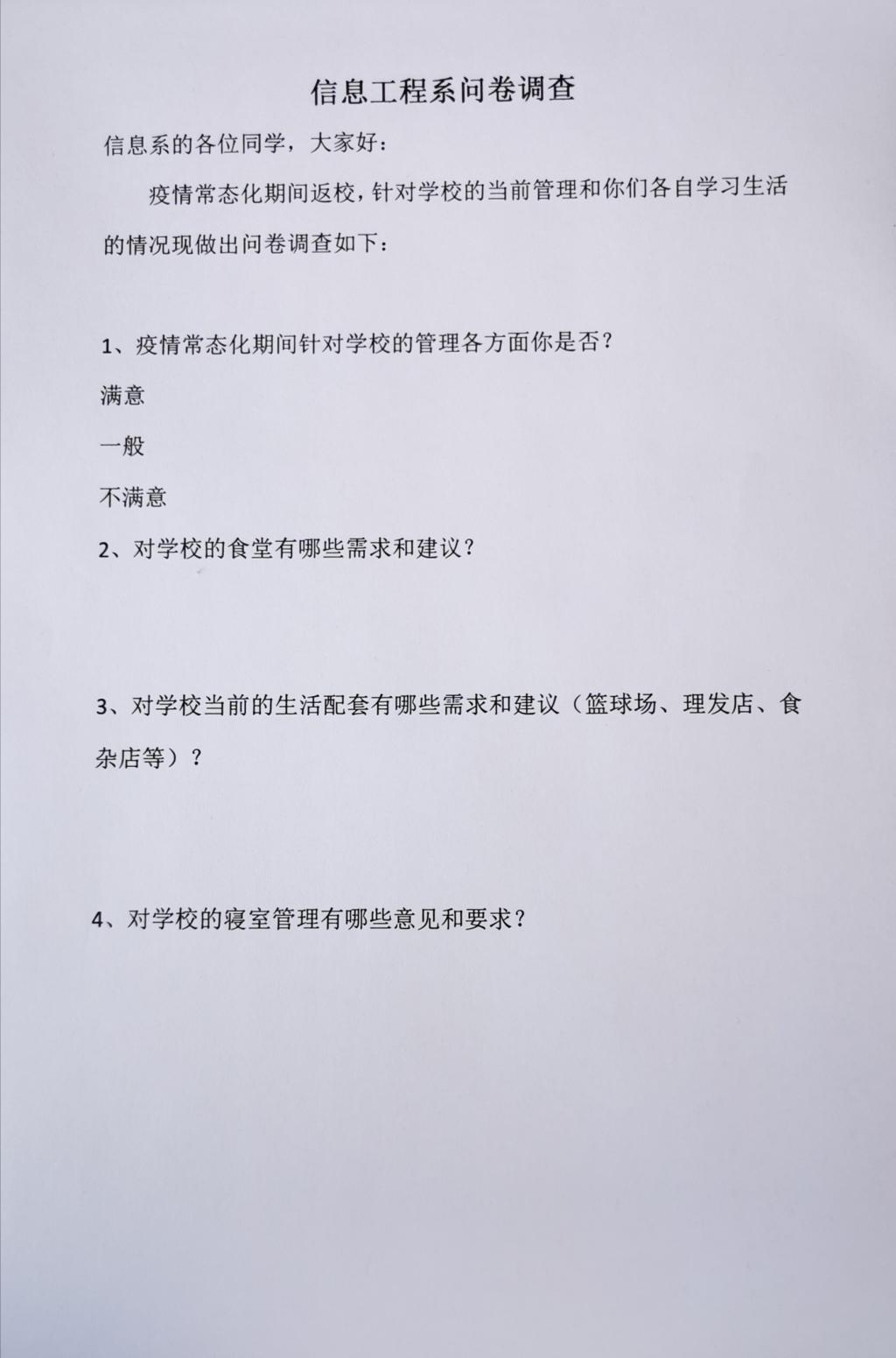 本次座谈会主要围绕学校疫情常态化管理的要求、针对学校的当前管理和同学们各自学习生活的情况进行详细的讲解,以问卷调查的形式对同学们提出的问题和建议收集并整理。