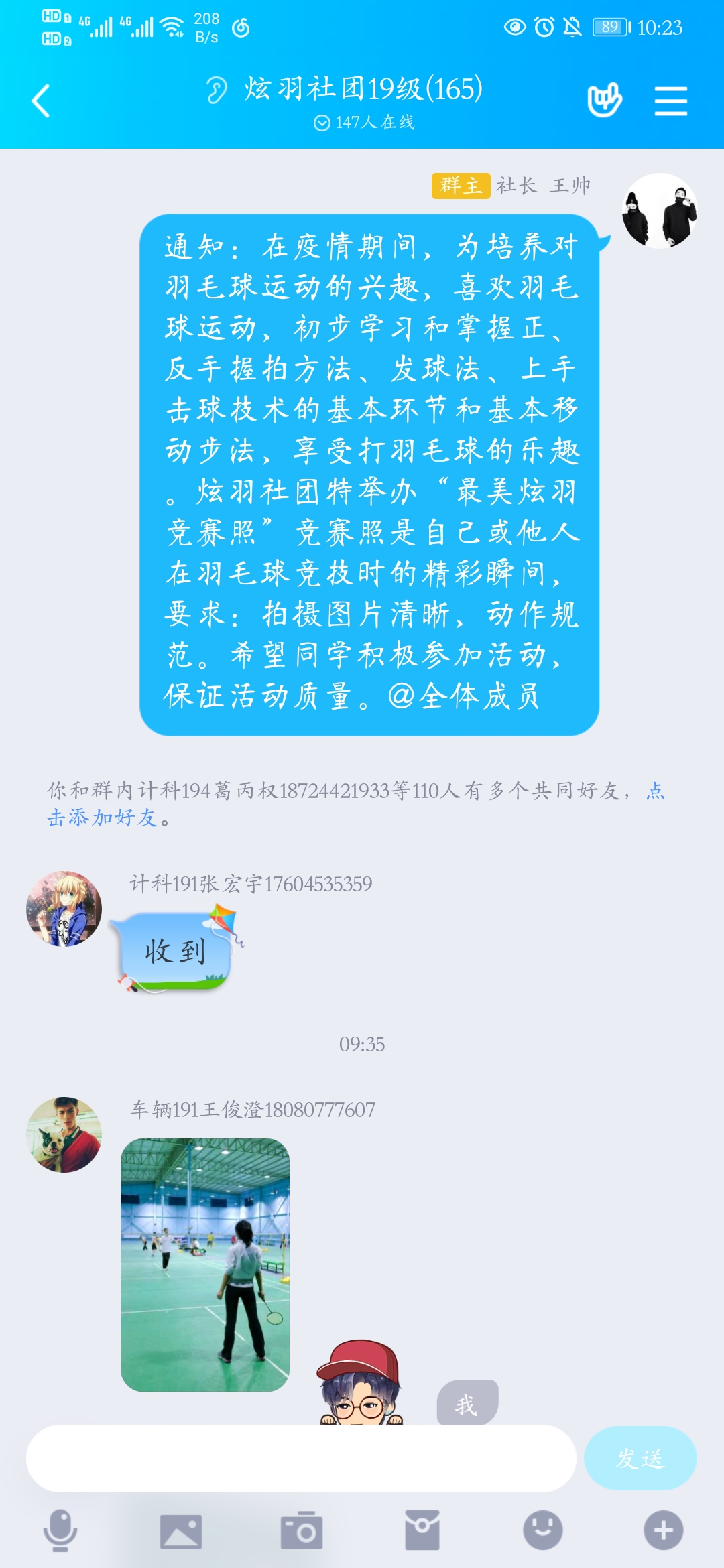 2020年6月7日,炫羽社团为丰富社团成员们的业余生活,培养成员们的团队精神,增强与成员之间的友谊和凝聚力,增强成员们的体质与身心健康。开展“最美炫羽竞赛照”线上主题活动。