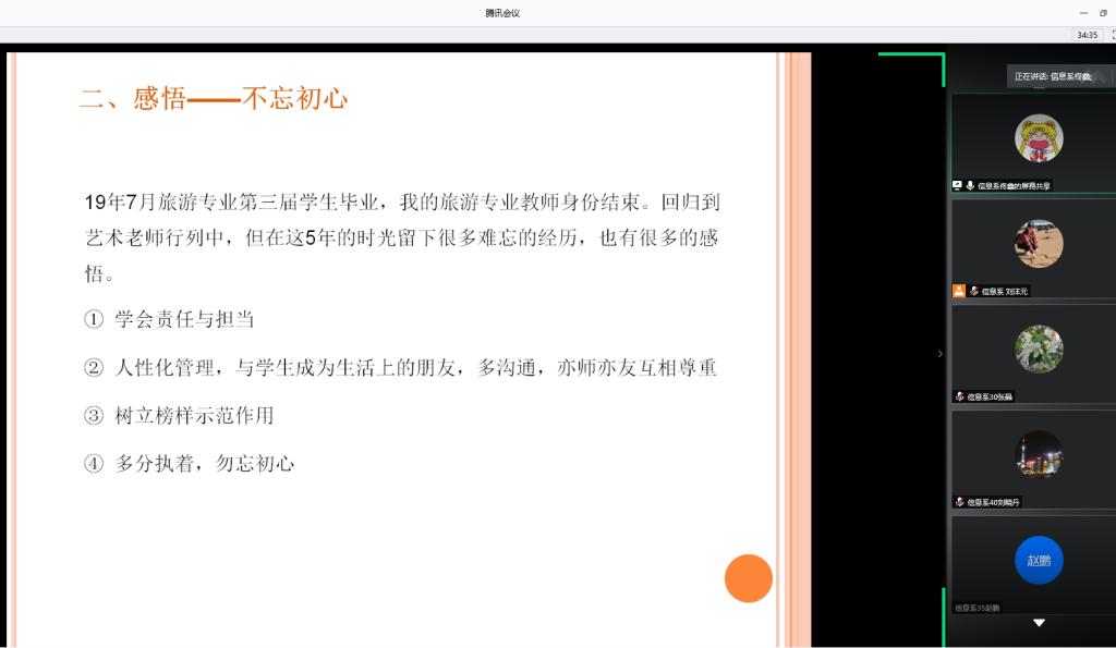 会议由视觉传达设计刘沣元老师主持。这次汇报无论新教师还是老教师都能将自己的来校经历与大家分享。入职不到1年的刘晓丹老师在分享中从“教”“学”“思”三个方面进行汇报,她谈到因为“喜爱”走上了教师这条路,虽然来校时间不长,工作内容却比较多,除了正常的教学工作她还兼职了辅导员,但是因为有学校的强大后盾和对学生们的喜爱,也为了能实现心中的梦想,让她坚信自己能做的更好。