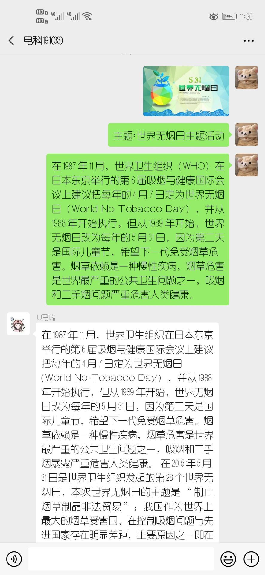 为让学生了解烟草危害,提高对自身健康的重视。2020年5月28日,电科191班通过班级微信群开展了“世界无烟日”主题团活。本次活动由组织委员康佳慧主持,电科191班全体成员参加。