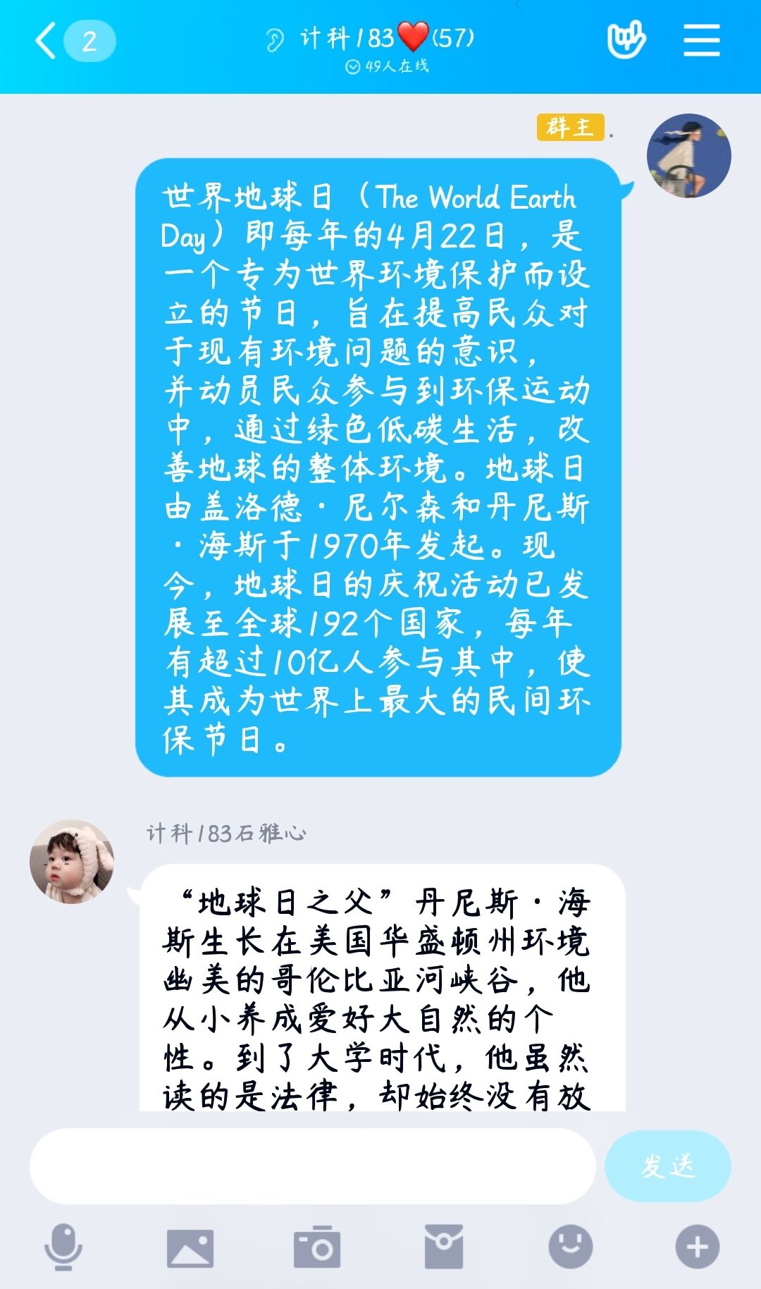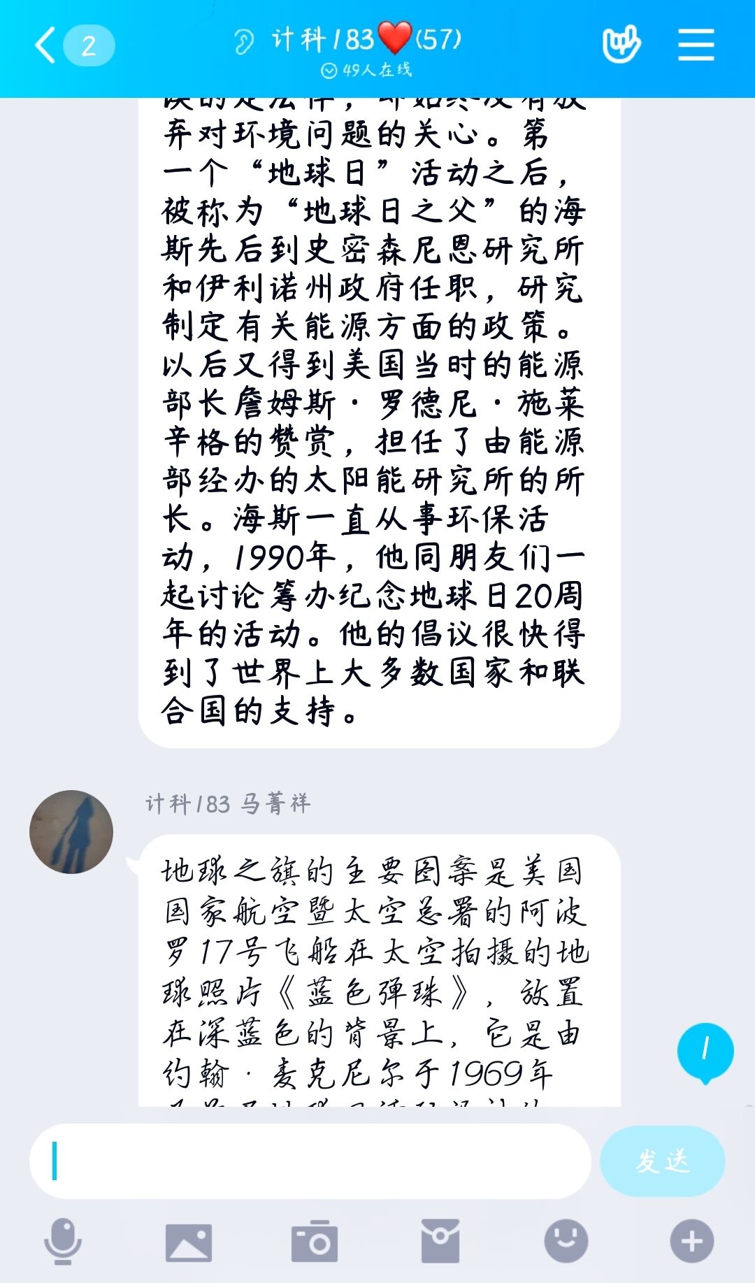 组织委员鼓励同学们积极参与到讨论会中去,畅谈自己所了解到的世界地球日,并发表自己的看法。同学们积极参与,将自己所了解到的知识和看法与全班同学分字,交流意见。