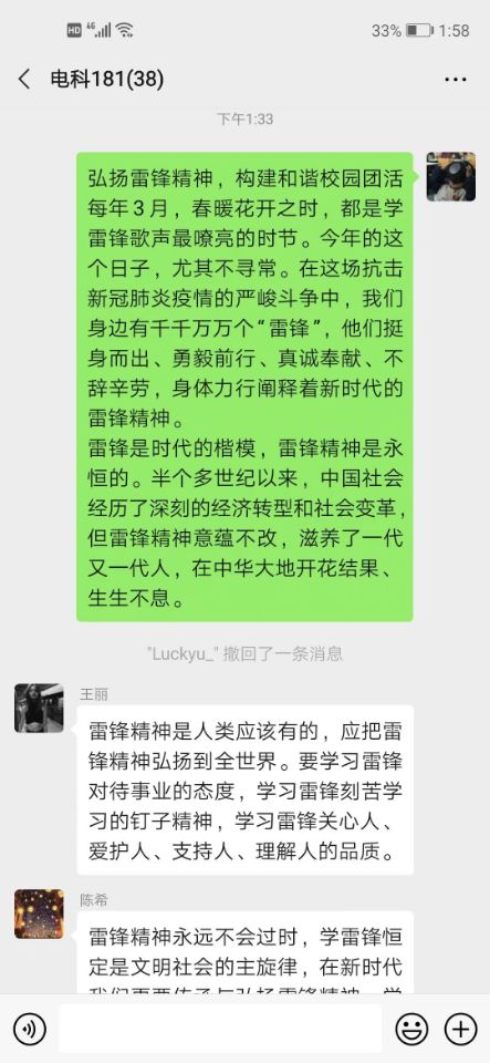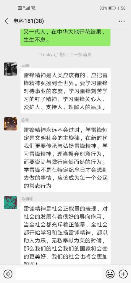 2020年3月5日,电科181班全体成员在线上讨论有关雷锋纪念日的相关内容。 雷锋精神集中体现了中华民族的优良传统,反映了社会主义和共产主义的价值观念和行为准则,凝聚着全人类共同珍视的时代精神的精华.学雷锋活动,已经成为加强思想政治建设的重要方面,教育培养青年的重要途径,传播精神文明的有效形式,弘扬先进文化的生动载体。 通过此次线上活动让我们了解了,要学习雷锋对待事业的态度,学习雷锋刻苦学习的钉子精神,学习雷锋关心人、爱护人、支持人、理解人的品质。