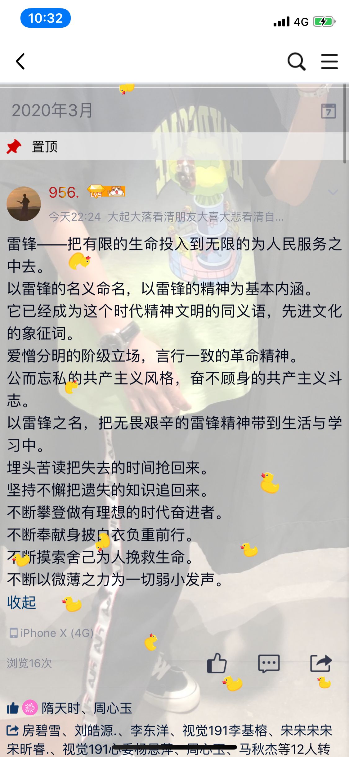 由于疫情原因,此次活动充分运用线上平台的优势,组织信息工程系学生们转载“雷锋——把有限的生命投入到无限的为人民服务之中去”主题宣传语,意寓传播“雷锋精神,人人可学。奉献爱心,处处可为。积小善为大善,善莫大焉。”的奉献精神,尤其面对这场突如其来的疫情,让同学们明白了当有人需要帮助时,大家搭把手、出份力,社会将变得更加美好,作为新时代的新青年更要忠实铭记爱党爱国爱人民的“赤子”精神,发扬助人为乐公而忘私的“奉献”精神,践行励志勤学刻苦钻研的“钉子”精神,学习忠于职守爱岗敬业的“螺丝钉”精神。