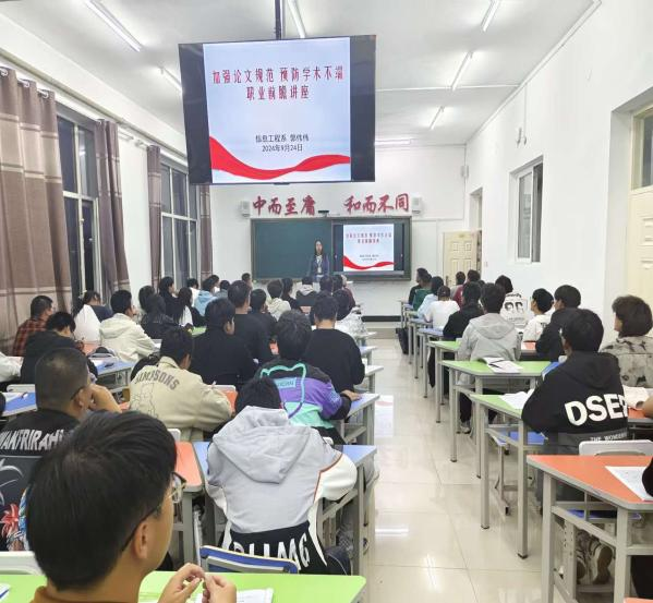 全国教育大会上提出紧紧围绕立德树人根本任务,朝着建成教育强国战略目标扎实迈进。为进一步加强学术诚信建设,强化学术道德教育,树立学术规范理念,9月24日下午,计算机科学与技术专业在一号教学区1403、1405教室,举办“加强论文规范 预防学术不端”职业前瞻讲座,由郭伟伟教授主讲,计算机科学与技术专业2024级全体学生参加。