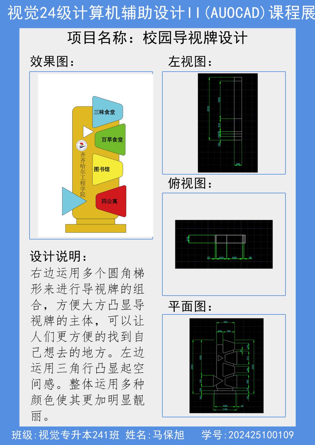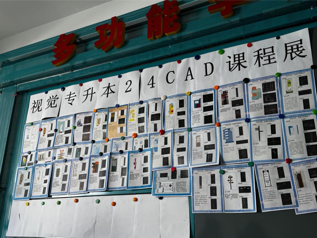 10月30日上午,视觉传达设计专业在一教四楼A区综合展示区举办专升本24级《计算机辅助设计IIAutoCAD》课程作品展,此次作品展由王慧茹老师指导,视觉专升本241班全体学生54人参加。