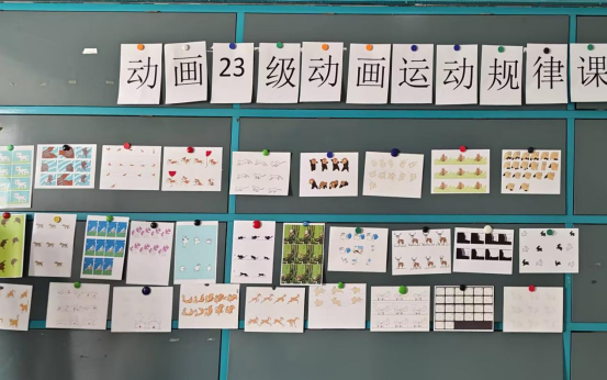 展板上,一幅幅充满想象力的作品让人眼前一亮。同学门以细腻的笔触描绘了小动物奔跑跳跃的灵动姿态,这些作品不仅展现了同学们扎实的专业功底,更体现了他们独特的创意和对动画艺术的热爱。此外,本次课程展还邀请其他班级学生来观看课程展览,这不仅有助于学生们进一步提升自己的绘画能力,也对动画运动规律这门课有了初步认识和体验。