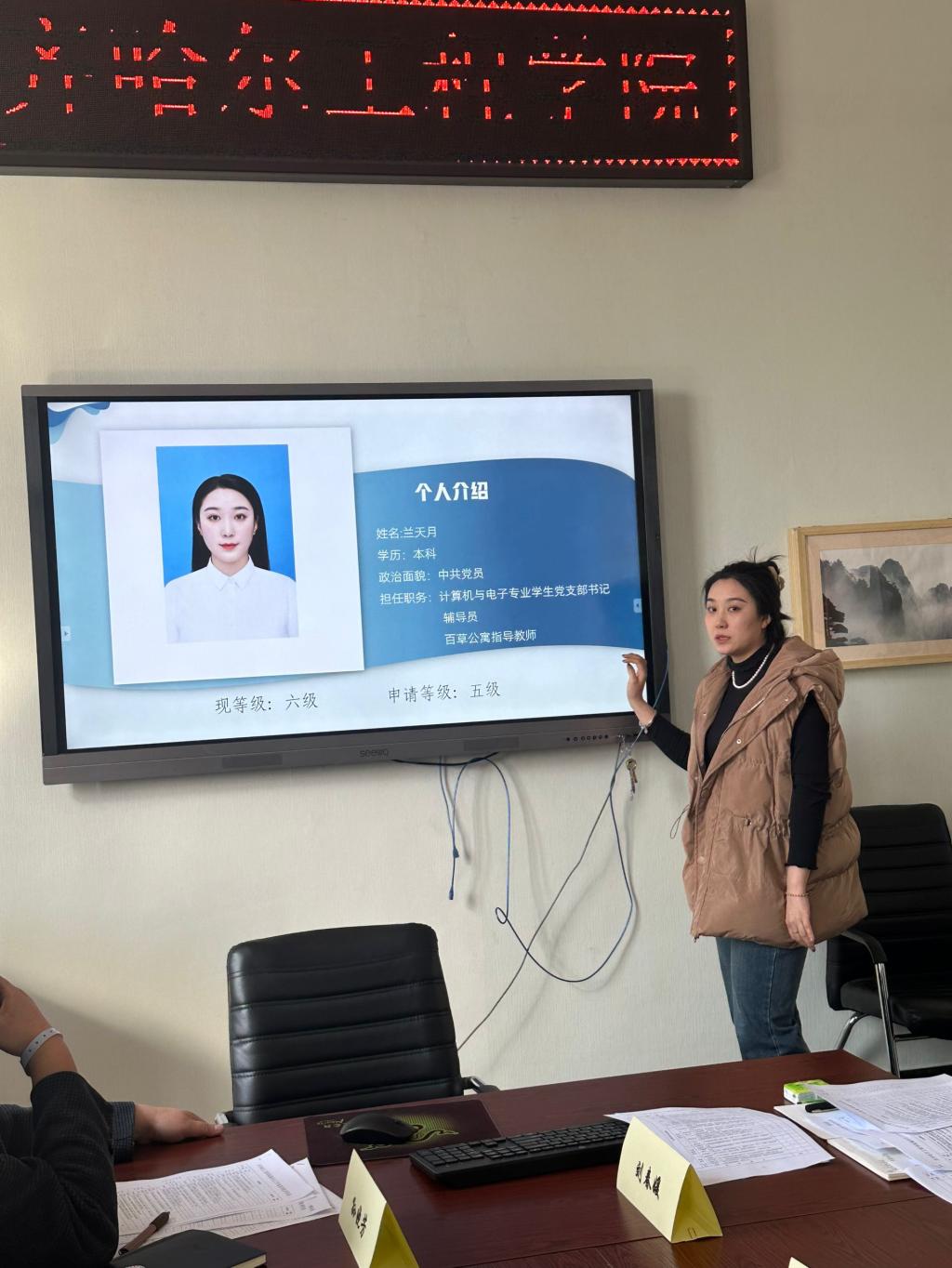 会上,孙晓芳对本次辅导员职级评定宣读了评定方案及具体要求,各位辅导员以PPT的方式进行自我情况介绍及申请职级。系领导和与会人员根据辅导员申报情况查阅佐证材料并进行讨论发言,形成初步意见上报。
