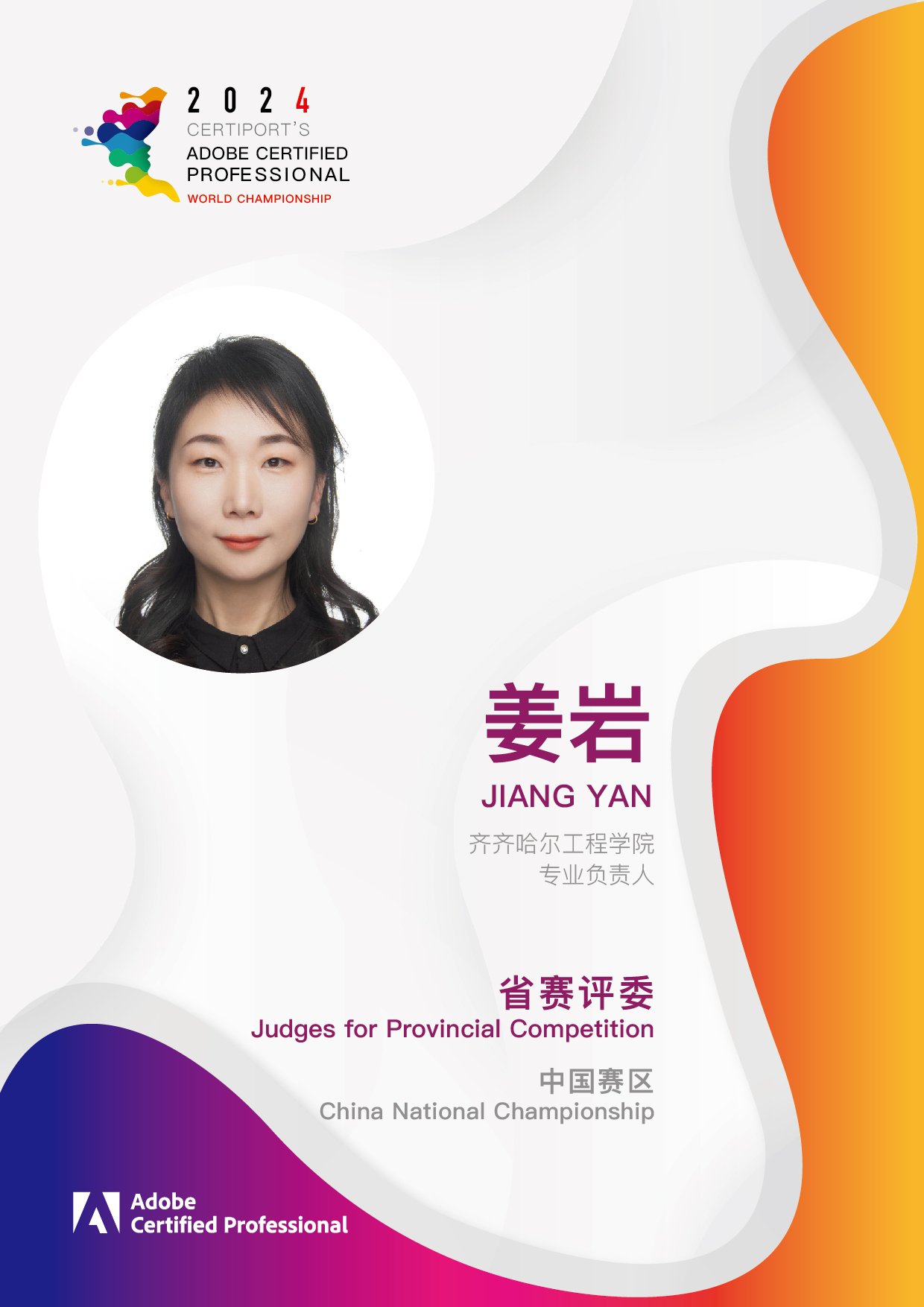 近日,我校信息工程系视觉传达设计专业负责人姜岩老师受邀参加了Adobe Certified Professional 2024年中国赛区省赛评委一职。此次大赛在中国多个赛区同时进行,姜岩老师受到了大赛组委会的高度认可和邀请。