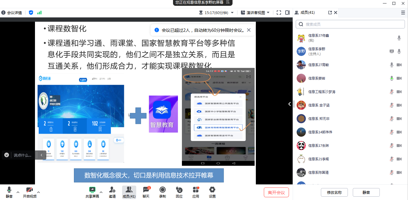 党的二十大以来,我国对课程数智化建设提出了诸多要求,从促进教育现代化、推动教育创新、深化教学改革到强化教师培训、促进数字资源共享等一 。2024年3月17日15时,信息工程系召开课程数智化建设研讨线上会议,本次会议由系教学副主任李野主持,系任课教师及行政兼课人员全部参加。