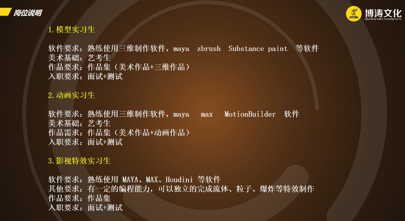 大连博涛文化科技股份有限公司,是大连地区最大的一家国际化的多媒体与动漫视觉设计公司。主营业务领域包括影视动画制作、模型制作、文化活动策划等方面。公司代表通过腾讯会议图文并茂地向同学们介绍了公司概况、业务领域、企业文化、人才培养以及职业发展等方面的内容。他们强调了公司在影视制作方面的专业能力和丰富经验,以及在模型建造和文化活动策划方面的创意和执行力。这些领域的介绍让同学们对博涛文化的业务范围有了更加全面的了解,这也让同学们对动画更加感兴趣。在介绍企业文化和人才培养方面,公司代表强调了博涛文化重视员工发展和团队合作的企业文化。他们表示,公司致力于为员工提供良好的工作环境和培训机会,鼓励员工发挥自己的创造力和团队合作精神。也借此为同学们展示了他们的作品成果,这对同学们来说都很震撼。公司代表与同学们分享了—些职业发展的建议和经验,他们鼓励同学们在大学多积累实践经验,提高自己的综合素质,为未来的职业发展打下坚实的基础。本次宣讲为同学们提供了模型实习生岗、动画实习生岗、影视特效实习生岗等多个岗位,希望感兴趣的同学能够准备好个人简历和作品集与企业联系或与专业教师沟通,积极参与到求职就业中,有机会能成为公司一员。
