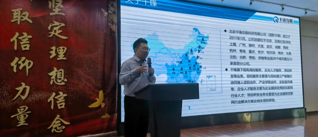 会上,孙晓芳副主任首先介绍了此次宣讲会的目的和意义,并简单介绍了北京千锋集团。随后,北京千锋集团招聘经理申伟通过PPT的形式介绍了公司的运营,行业现状和未来前景。并介绍了往届招聘大学生的情况和现阶段他们的工资待遇。之后,企业组织对公司比较感兴趣的毕业生进行了二次详谈,与学生互动,解答学生的疑问。对毕业生关心的前期培训、吃住等问题一一解答。最终与部分学生签订初步培训计划。
