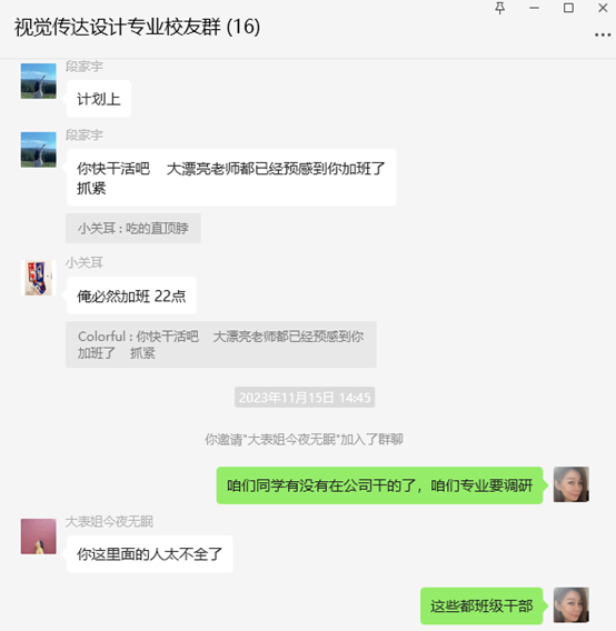 为深入学习贯彻落实党的二十大精神,落实党中央、国院“稳就业”“保就业”决策部署,抓住秋季开学后求职招聘黄金期,摸排毕业生求职意向和就业困难,集思广益,攻坚克难,全力做好就业创业指导服务,助力毕业生毕业去向落实率稳步增长。2023年11月15日,信息系教学副主任姜岩、视觉传达设计专业长任杰对视觉传达设计专业校友进行调研。