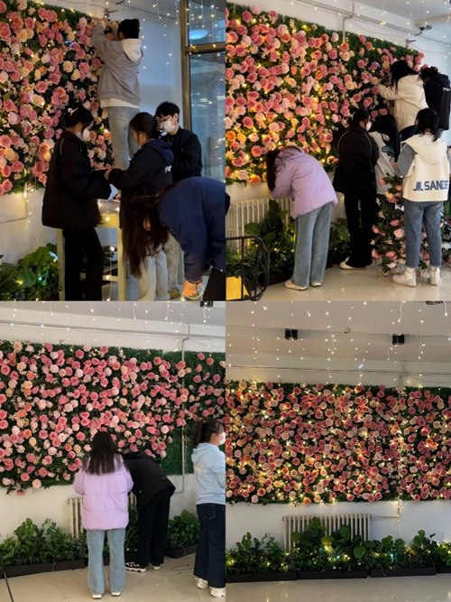 活动开始前,公寓主任张晓玉为学生们普及了此次布置的主题,以及制作方法,花卉种类等方面的知识,花海墙作为近年来日益火爆的网红打卡项目,其造型美观大方,令人赏心悦目,极度适宜观瞻。随后,公寓主任张晓玉亲自动手示范,在她的指导下,信息工程系的12名公寓学生积极动手参与,随着时间的流逝,华灯初上,花海墙的布置也大功告成。在熠熠生辉的星空灯照耀下,更显得高贵、美丽、优雅。
