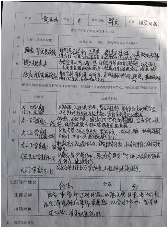 此次新生学年学习规划指导由8名生涯导师分别带领41名学生,共分为“自我认知、了解专业、树立目标、时间安排与填写学习规划表”五方面。教师们首先对同学们进行具体指导,他们在指导中指出“自我认知与定位在学年规划中起到相当大的作用,无论是现在的学习还是以后的就业,只有自我了解明确了、自我定位准确了,才能树立准确且实际的目标并扎扎实实的完成它。”指导过后又让学生们填写了学年学习规划表,并由各自指导教师评分。学生们在指导中不断完善和丰富自己的学习规划表,纷纷表示通过此次指导与评分,明白了规划在学习中的重要性,今后也会按照自己制定的学年学习规划表来严格要求自己。