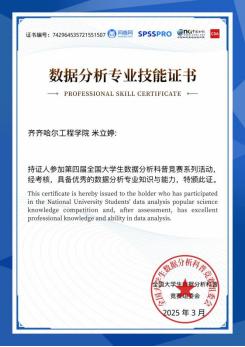 在学习上,米立婷在校期间成绩优异,无挂科情况,并获得四次校级二等奖学金,两次校级三等奖学金。同时,她还考取了数据分析专业技能证书、OceanBase数据库V3数据库认证专员以及HarmonyOS应用开发者初级和高级认证。