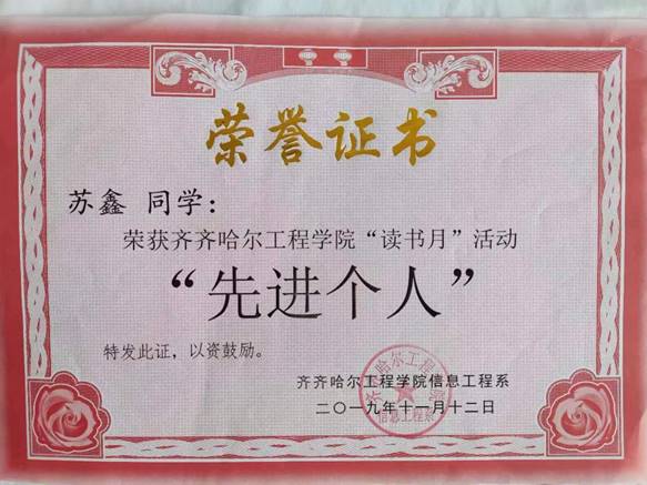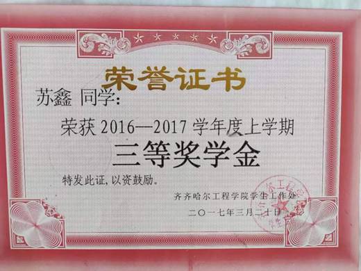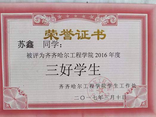 “吾日三省吾身,择其善者而从之,其不善者而改之,见贤思齐,见不贤而内自省也。”对于大学而言的最佳理想状态莫过于不断的思考自己,不断的提高自己。在这点上,苏鑫为自己的大学交上了一份满意的答卷。自从入校后,他就始终坚持不懈,不断进行自我教育、自我完善、自我成长,帮助同学一起进步,自习室和教室无处不是他认真学习的身影。