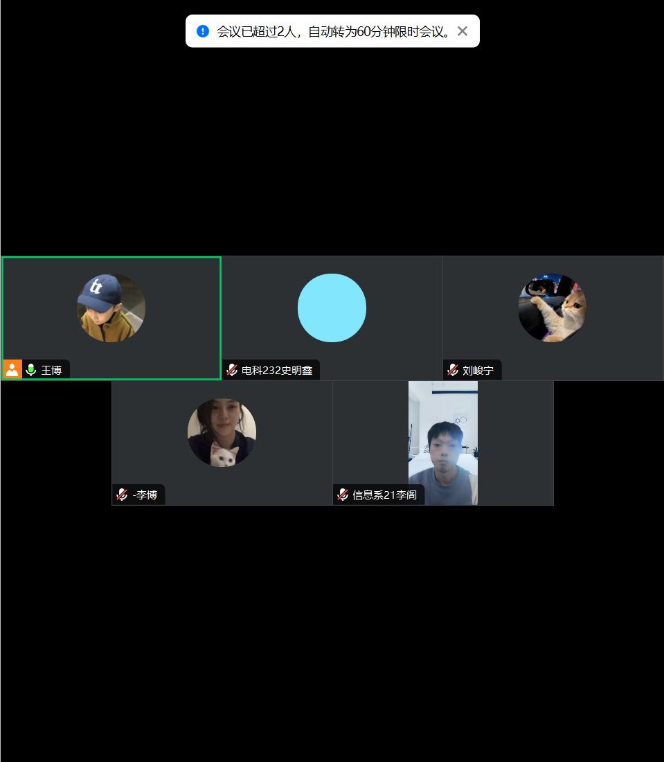 1月10日上午,电科232王博,电科232史明鑫,电科232李博,电科232刘峻宁通过腾讯会议召开第四学期第一次会议,对本周活动内容展开交流,由王博主持,4人参加。大致分为3个目标。