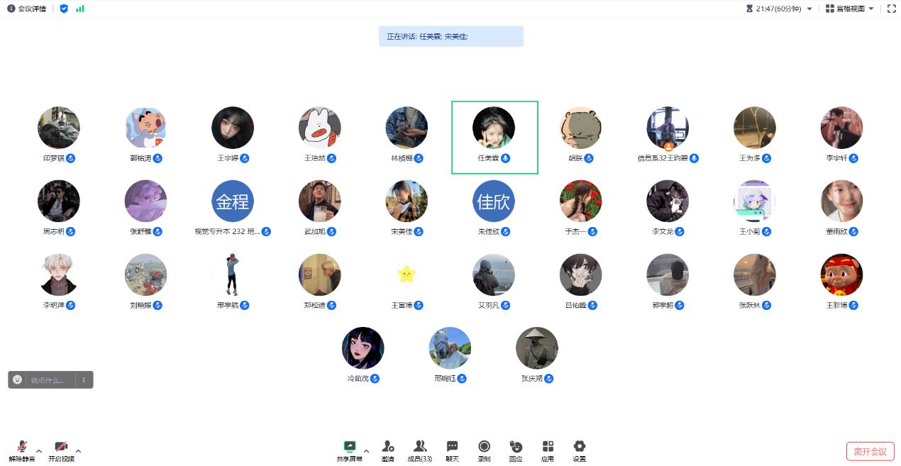 1月19日下午,王昀碧老师在腾讯视频会议召开第三学期第三周的工作汇报,视觉专升本232班36人参加。