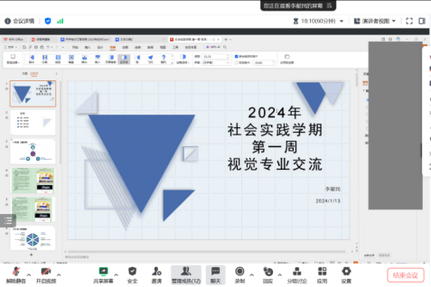 1月16日上午,生涯导师李宪民在腾讯会议召开了2024年社会实践学期第一周视觉专业交流,会议由李宪民老师主持,共12人参加。