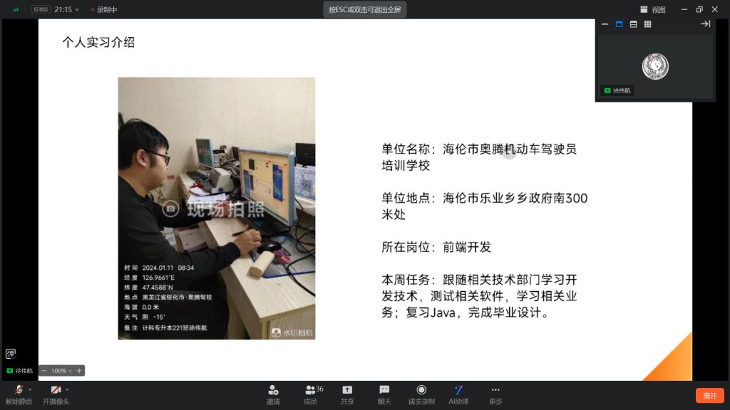 首先,学委张宇航介绍会序,组织尹智强、刘海洋、刘建华、于子航、孙世伟、李金龙、卢丁华、杨麒龙、崔可心、张晓锋、徐伟航、何金龙汇报第二周专业实践情况,12位同学从实践的内容、收获、不足和改进措施等方面进行总结。