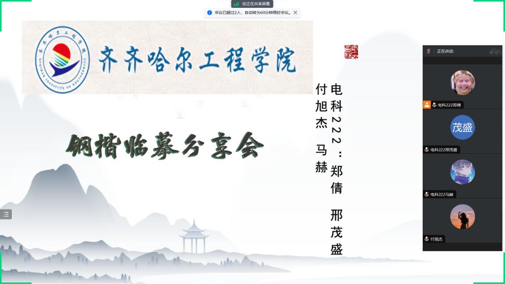 首先,根据学校关于社会实践学期所作出的相关安排,小组成员如期开展相关学习任务并进行此次钢楷临摹分享会。通过小组成员分享各自的钢楷临摹心得不难看出,经过一段时间的练习,同学们对于如何提升自己的书写水平各有所得。
