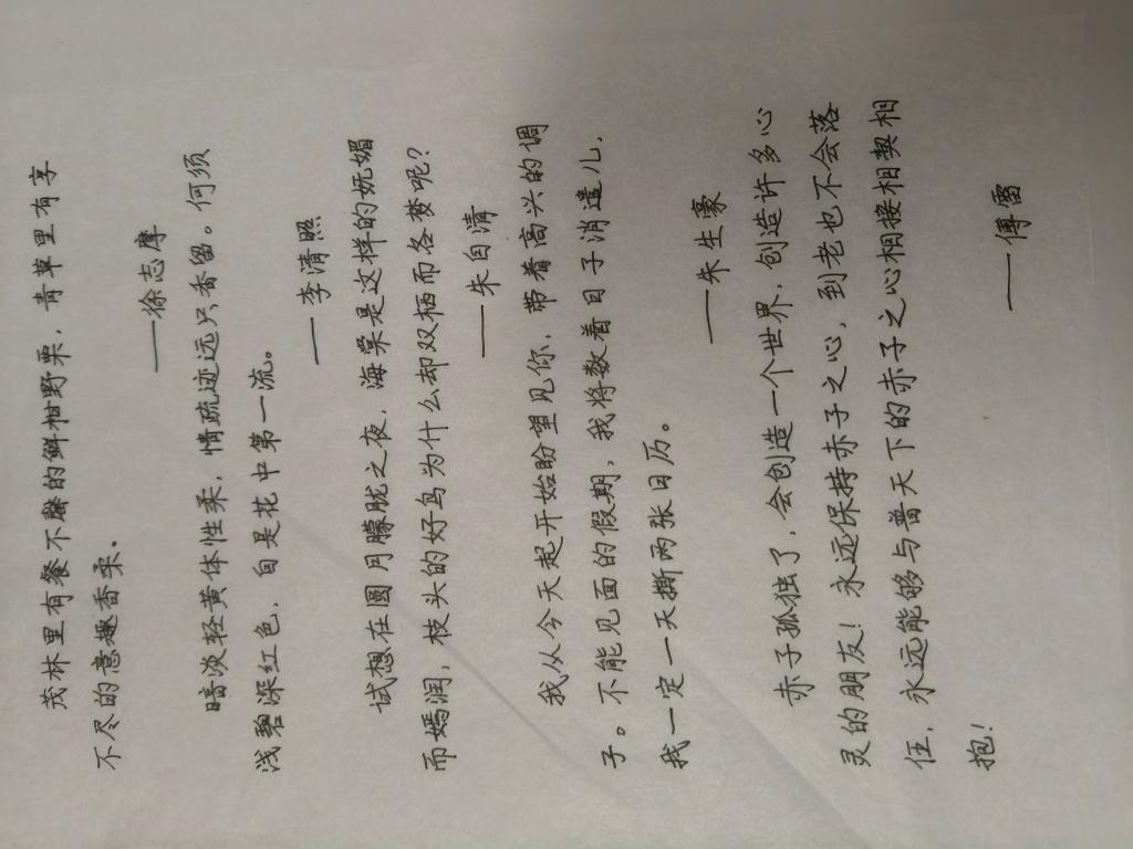 在过去的一周中,本组的钢楷临摹以每人每天一到两页的进度稳步前进,有条不紊的执行中,阅读任务上,组员已将自己所选读的书籍购回,并安排好接下来的阅读任务以供执行,调研报告,回访母校,家乡美等任务也在框架构建与多方协调中执行,确保任务的顺利完成