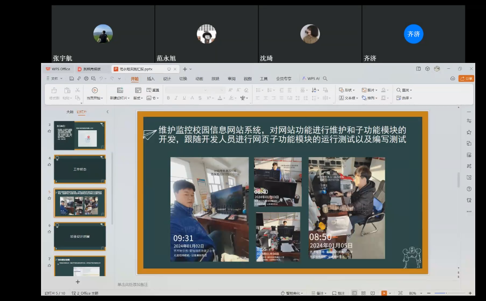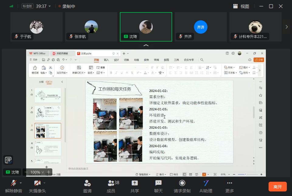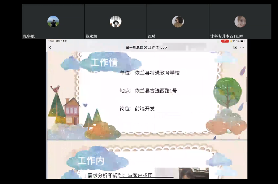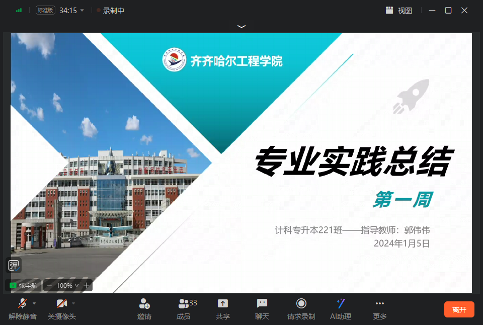 1月5日中午,信息工程系计科专升本221班在钉钉平台召开专业实践学期第一周总结会。总结过去一周校外课堂实践的经验,并为未来的专业实践提供借鉴。学委张宇航主持,指导教师郭伟伟和计科专升本221班全体同学参加。