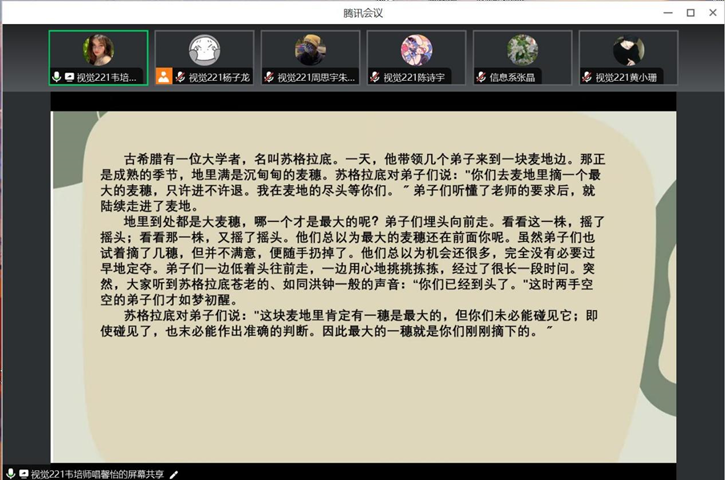 7月22日晚,视觉221班全体同学通过线上的形式召开腾讯会议,进行第五周的实习实践总结会,由张晶老师组织,共37人参加。