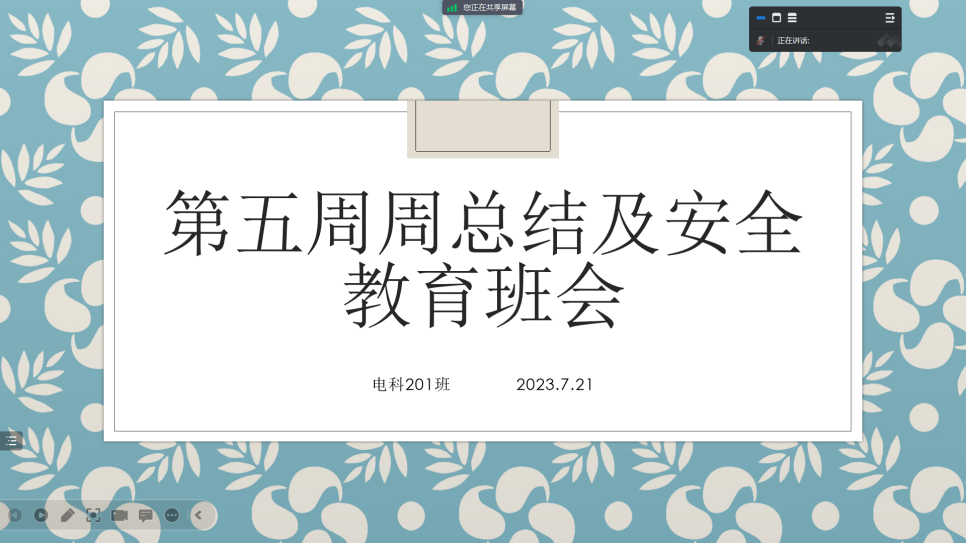 2023年7月21日晚8:30,主持人韩楠楠老师组织召开“第三学期第五周总结和安全教育班会”腾讯会议,电科201班42人全员参加。
