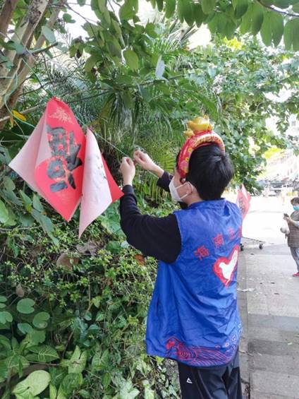计科专业222班潘子洋同学秉承着“服务社会,奉献爱心”的初衷,与其他志愿者一起参加活动前现场布置、活动中春联发放及秩序维护等工作。