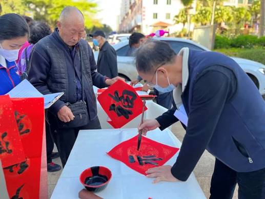 1月14日上午,在中共澄迈县委组织部、澄迈县金江镇党委的指导和支持下,金马东社区党群服务中心、乡村振兴工作队联合澄迈县妇联、澄迈县文联、海口市飞熊社会工作服务中心开展以“万福迎新春 墨香暖民心”为主题的新春送祝福活动。