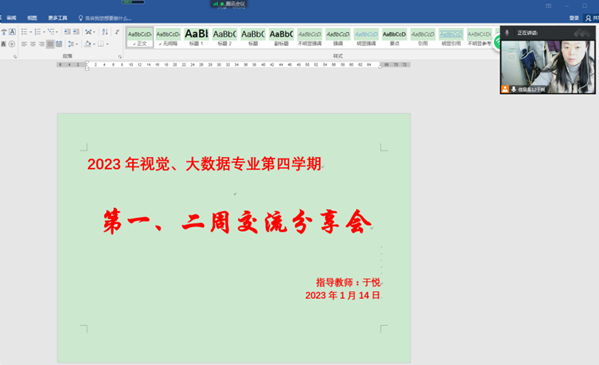 1月13日,于悦老师组织学生开展了第四学期一二周汇报,本次会议由于悦老师主持,全体同学共同参加。