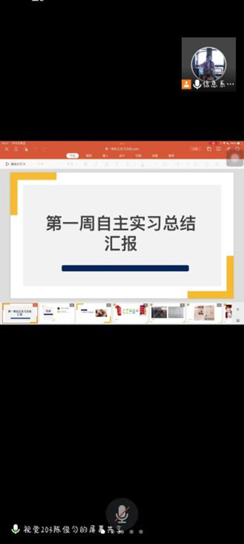7月8日,视觉203班通过腾讯会议的形式召开第三学期本周实习汇报总结,本次会议由王昀碧老师主持,视觉203班全体同学参加。