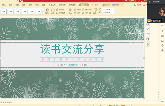 1月14日,第四学期杨宇欣小组以腾讯会议的方式第一次开展线上的读书交流分享会,此次会议由视觉191班王哲做PPT汇报,其他小组成员进行书籍分享。