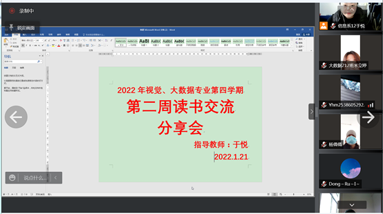 1月21上午,第四学期指导教师于悦通过腾讯会议组织召开第二周读书总结会,24名同学参加了会议。