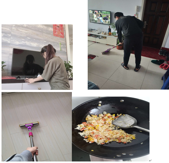 每个组员在家中都帮助父母做事情,我们会一起讨论从中收获到了什么,虽然由于疫情的原因,我们没办法聚集在一起,但因为网络的发达,我们也参与了解了彼此的活动。