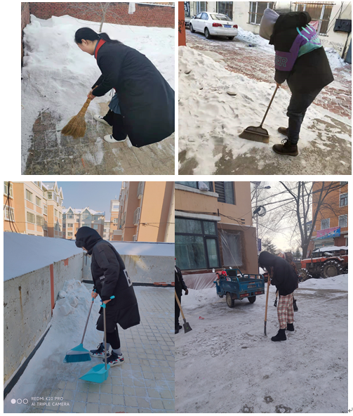 本周是第四学期开展的第一周,本着为尽快消除积雪给社区交通带来的诸多不便,GY-050小组于2021年1月16日下午,组长软件191杨帆带领其小组成员电商191张美旭、电商191王文艳及视觉191宋婵玉对各个社区的积雪进行清理。