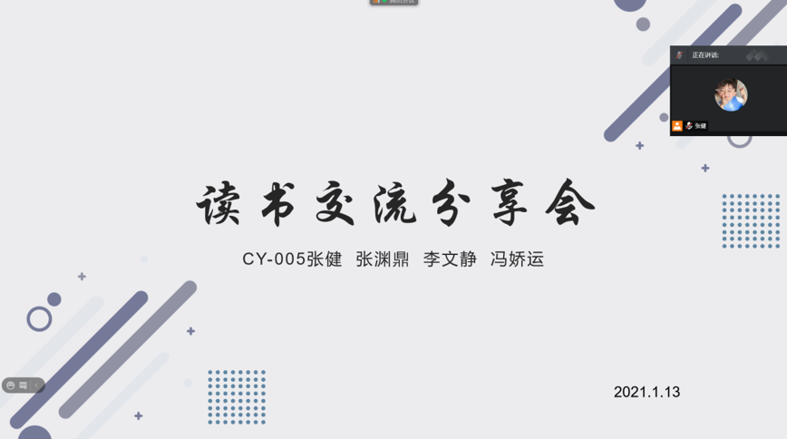 2021.1.13上午,CY-005小组通过腾讯会议召开“线上读书交流分享会”。本次分享会主要是分享大家第四学期借阅的书籍名称,并且分享了借这些书的原因,通过这一段时间的阅读,简单的分享了自己的阅读心得。