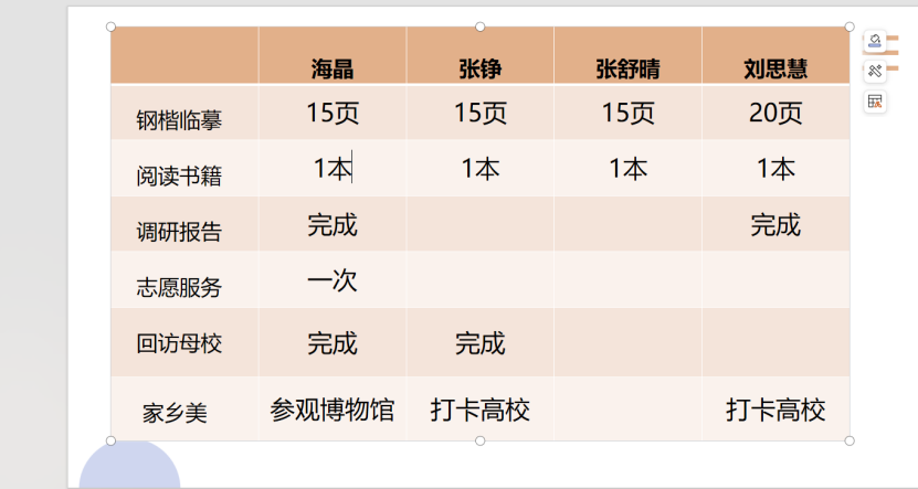 在书写技能提升方面,四位同学积极进行钢楷临摹。海晶、张铮、张舒晴均完成了 15 页的临摹任务,刘思慧更是超额完成,临摹了 20 页,他们通过一笔一划的练习,提升了书写水平。