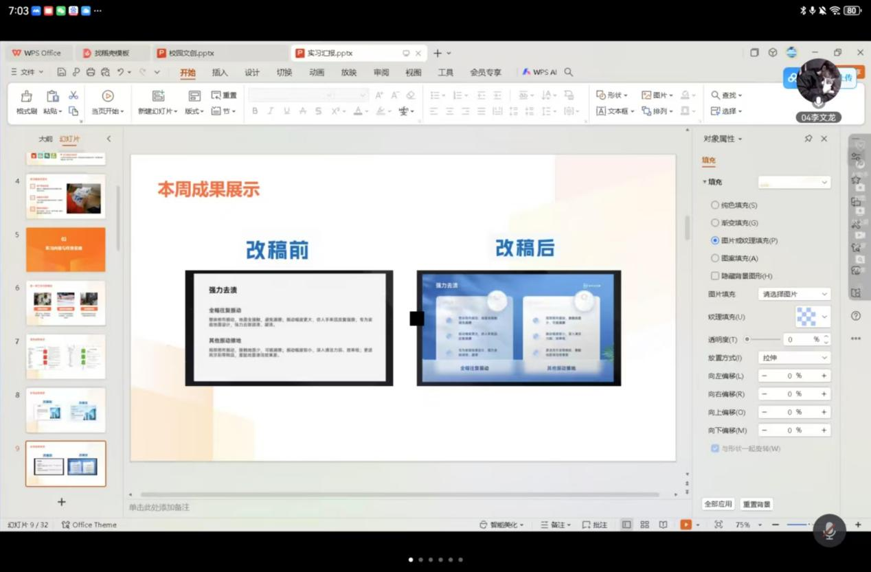 本次会议以了解学生的第三周工作完成情况,针对三周工作中出现的问题进行解答为目的开展。会议开始由胡朕,李文龙,朱佳欣,宋美佳,张舒雅,董雨欣六位同学进行汇报,胡朕同学首先汇报自己在实习期间学习如何制作海报并且更改,之后李文龙同学向大家介绍自己的工作环境以及三周的工作内容,朱佳欣同学将自己在公司接到的任务以及完成的作品向大家一一展示。在会议的最后赵倩雪老师对同学们绘制学校文创进行了查看,对于学校文创思路好的同学进行了表扬,并表示希望其他同学要向他们学习,完善自己文创想法。