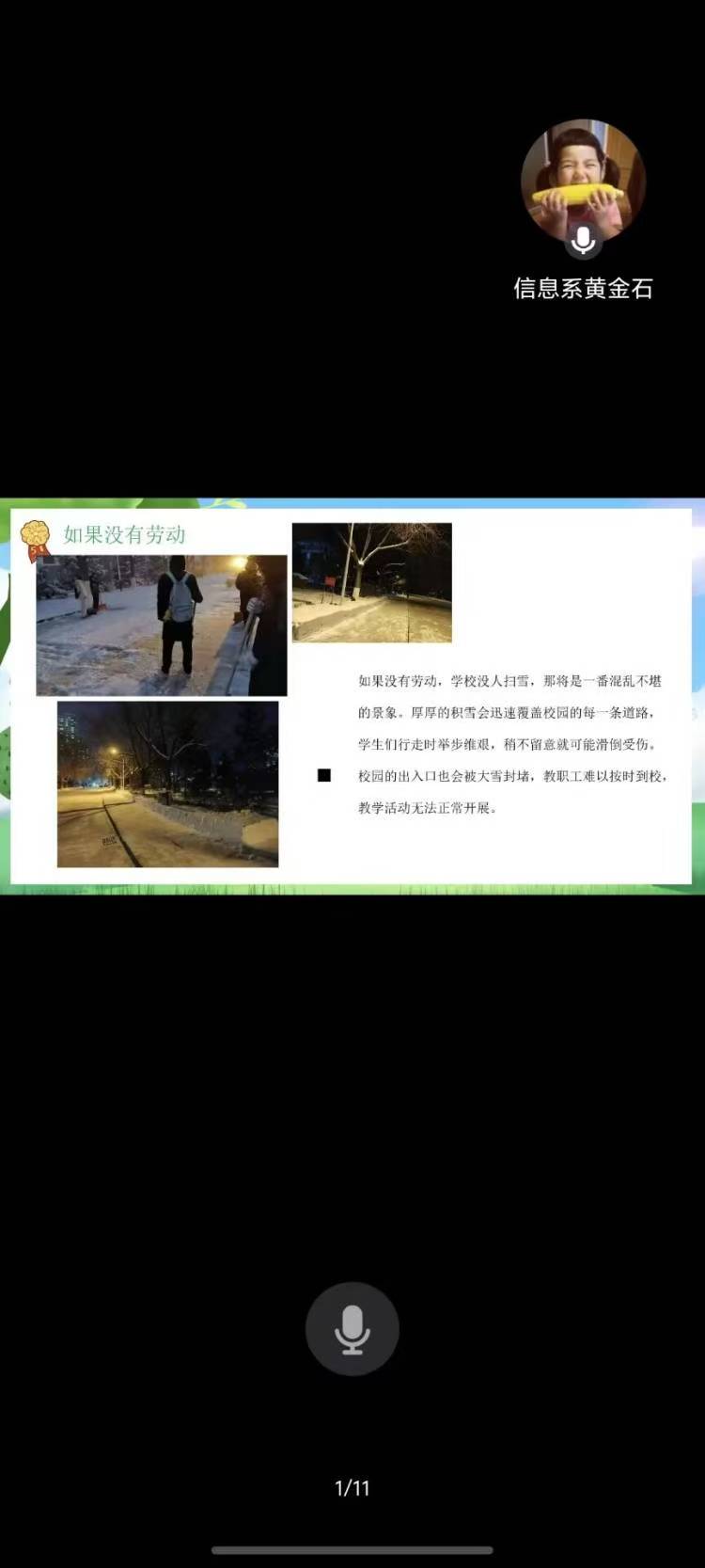 首先,黄金石老师着重强调劳动教育的重要意义,并指出,劳动不仅是创造物质财富的手段,更是培养坚韧品质、责任意识与团队协作精神的关键途径,鼓励同学们利用社会实践学期积极参与劳动实践。随后,盖晟喆同学通过精心制作的PPT,从劳动的历史演进、现代社会中劳动的多样性,到校园与生活里劳动的具体体现,进行了全面且细致的讲解,部分同学也分享了社会实践学期的劳动成果,如做家务,参与志愿活动等。最后,黄金石老师对同学们的分享给予充分肯定,鼓励大家将劳动精神融入日常,从身边小事做起,不断提升自身劳动素养。