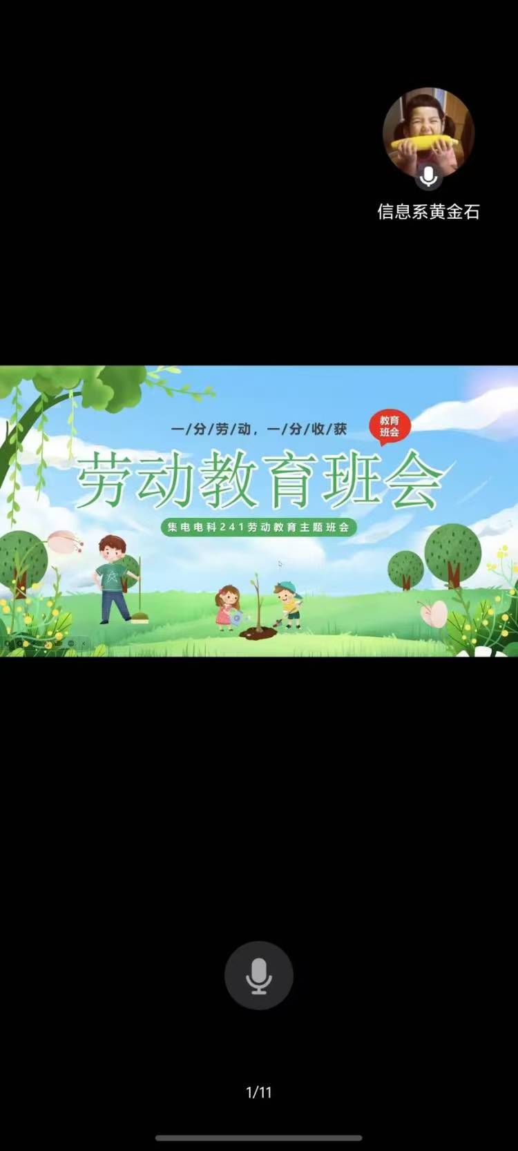 211日下午,为深入落实劳动教育,提升同学们对劳动价值的认知,集电241班与电科241班以线上会议的形式,联合开展了一场别开生面的劳动教育主题班会,此次会议由辅导员黄金石老师主持召开,两班全体同学积极参与。