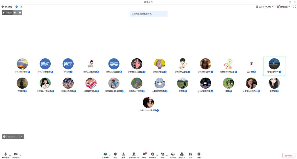 1月24日晚,指导教师郭伟伟召开了腾讯会议,对所带6个小组第四学期第三周社会实践情况总结,纵向班级班长计科222班孙晗哲支持会议,生涯导师郭伟伟发言,6组生涯学生参会。